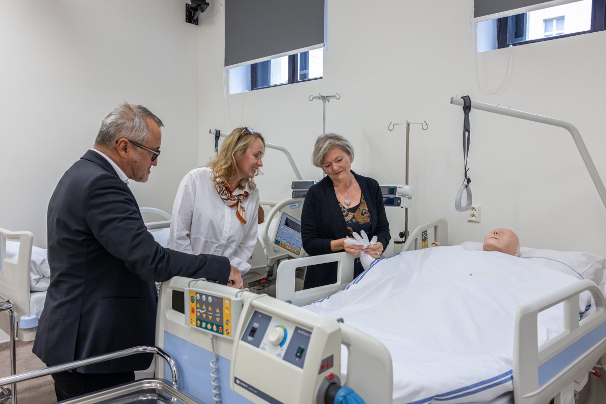 Shodou okolností se souběžně se spuštěním vládního programu fakultě otevřela možnost začít k výuce ošetřovatelství využívat budovu na adrese Studničkova 7. Budova, která byla dříve pronajata ČVÚT, se začala připravovat již v dubnu 2024. Nové výukové centrum v uplynulém roce prošlo renovací a adaptací pro výuku ošetřovatelství – nejen pro sestry, ale i mediky. Ústav teorie a praxe ošetřovatelství tak bude moci svoji výuku zkvalitnit a zefektivnit: „Náš ústav garantuje dvě základní oblasti výuky – ošetřovatelství a laické první pomoci. Doposud jsme učili všechny předměty v ‚univerzálních učebnách‘ pro obě zmiňované oblasti. Cokoliv, co funguje na principu dva v jednom, je ale nouzovým řešením. Obrovské množství času nám zabralo pouhé přesouvání pomůcek a modelů. Proto otevření nového centra velice vítáme,“ říká Beáta Švárová a přibližuje, jak bude výuka nyní fungovat: „Učebny jsme teď mohli ve dvou našich budovách tematicky rozdělit – v původních prostorách budou vyučovány předměty první pomoci, a to pro všechny lékařské i nelékařské obory. V nových prostorách vzniklo centrum ošetřovatelství, které disponuje místností na demonstrační výuku ošetřovatelských postupů, třílůžkovým nemocničním pokojem a učebnou pro teoretickou výuku. Tím ušetříme spoustu času, který budeme moci věnovat našim studentkám a studentům.“